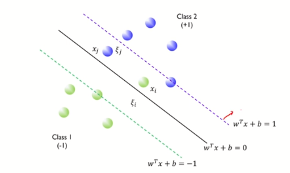 $y_i(w^Tx_i+b)>1$이 되어야 한다. 즉, plane을 벗어나는 점들이다.